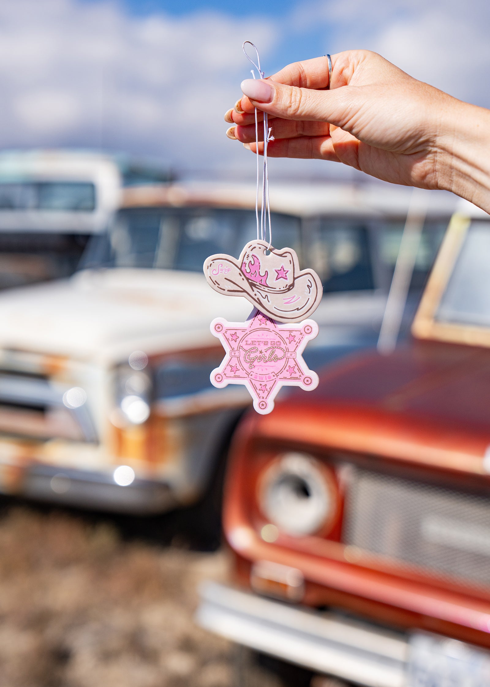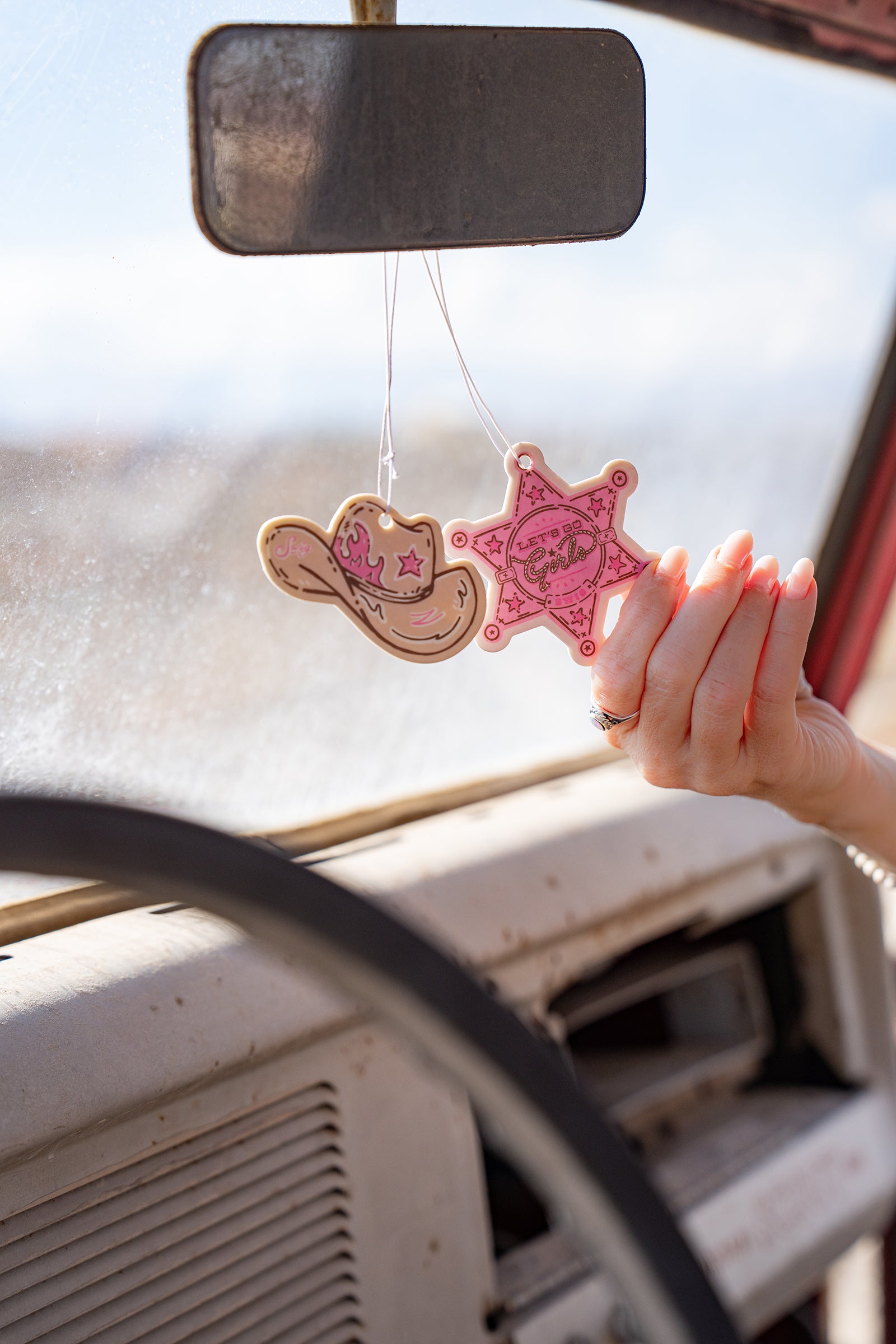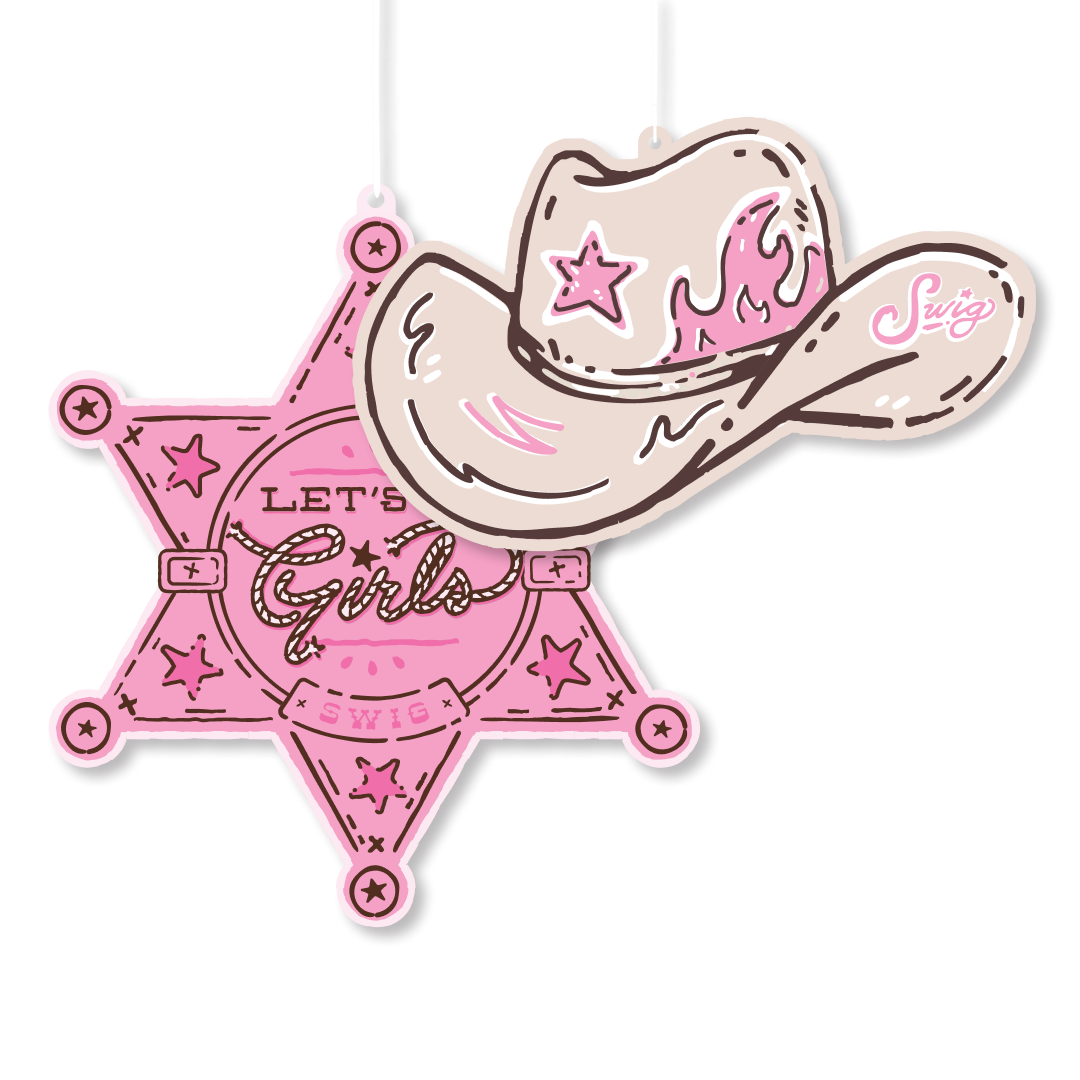 - Set of 2 air fresheners (Cowgirl Hat + Sheriff Badge designs)